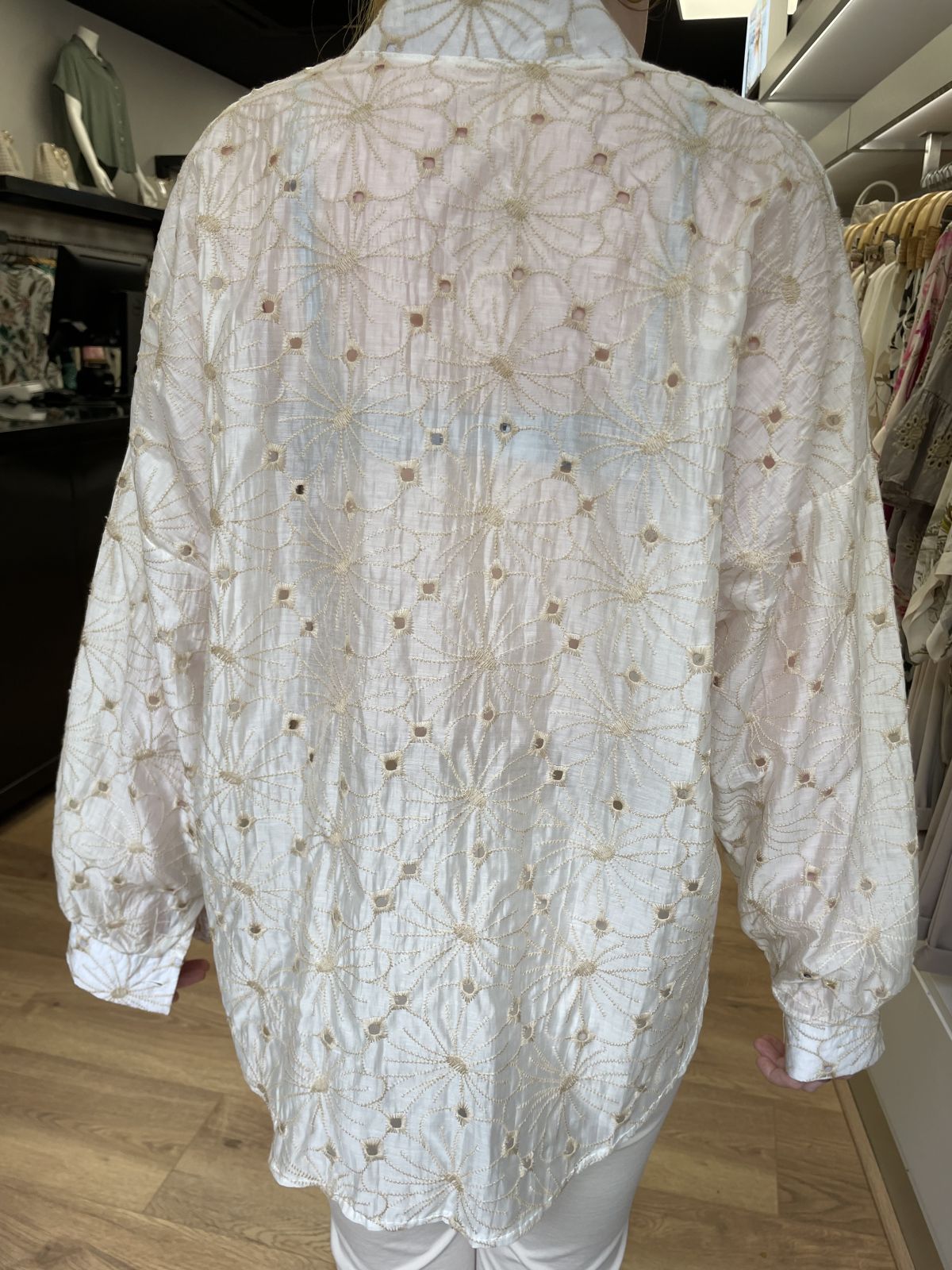De blouse heeft een staande kraag, lange mouwen met smalle manchetten en een volledige knoopsluiting, waardoor je 'm ook open kunt dragen als luchtige overshirt. De natuurlijke katoenen stof voelt prettig aan op de huid en is ademend, perfect voor een stijlvolle look op warme dagen. Dankzij het langere model draag je deze blouse makkelijk los over een strakke broek of legging, of in combinatie met een korte jeans of rok. Valt als maat M/L.