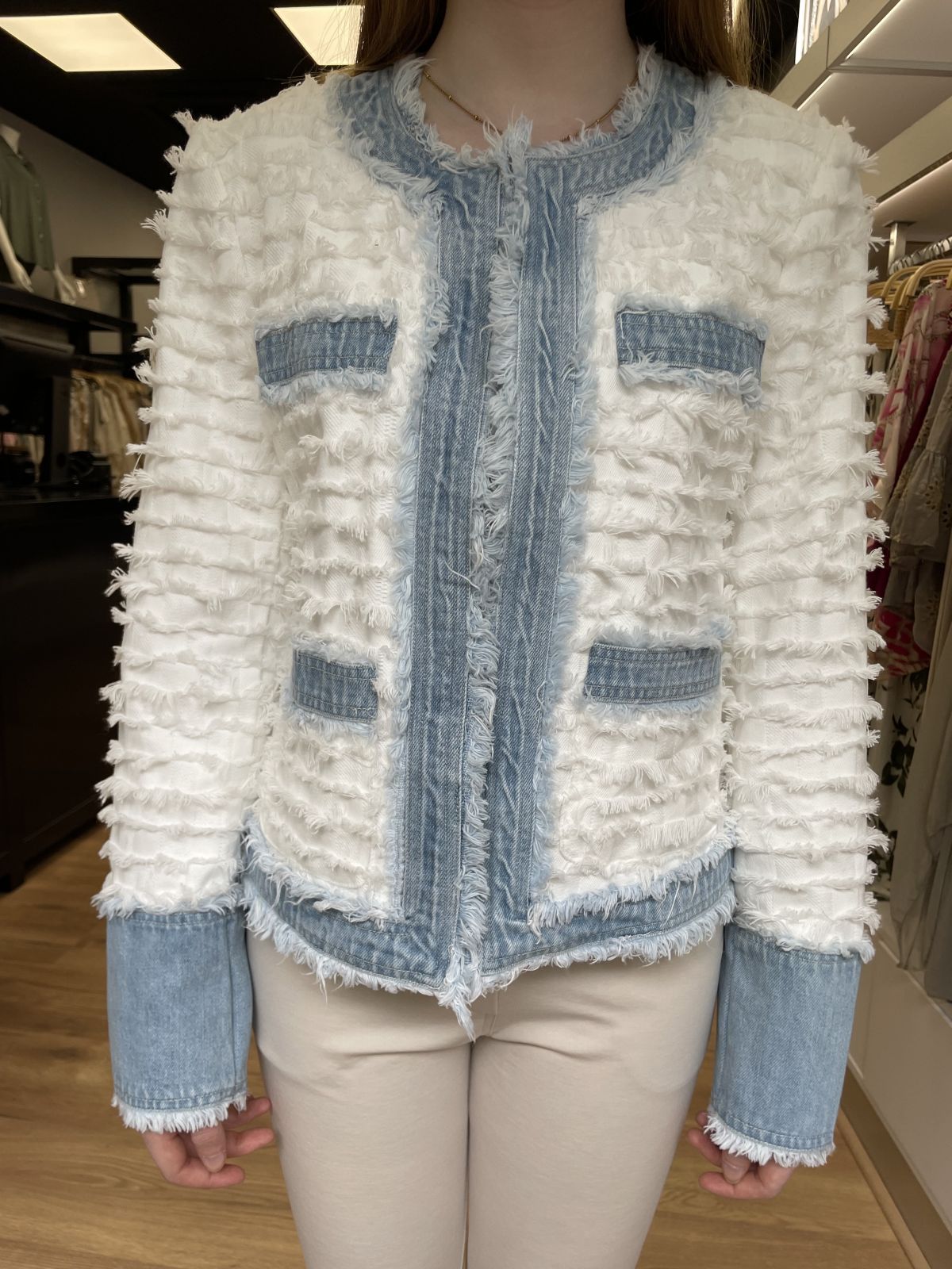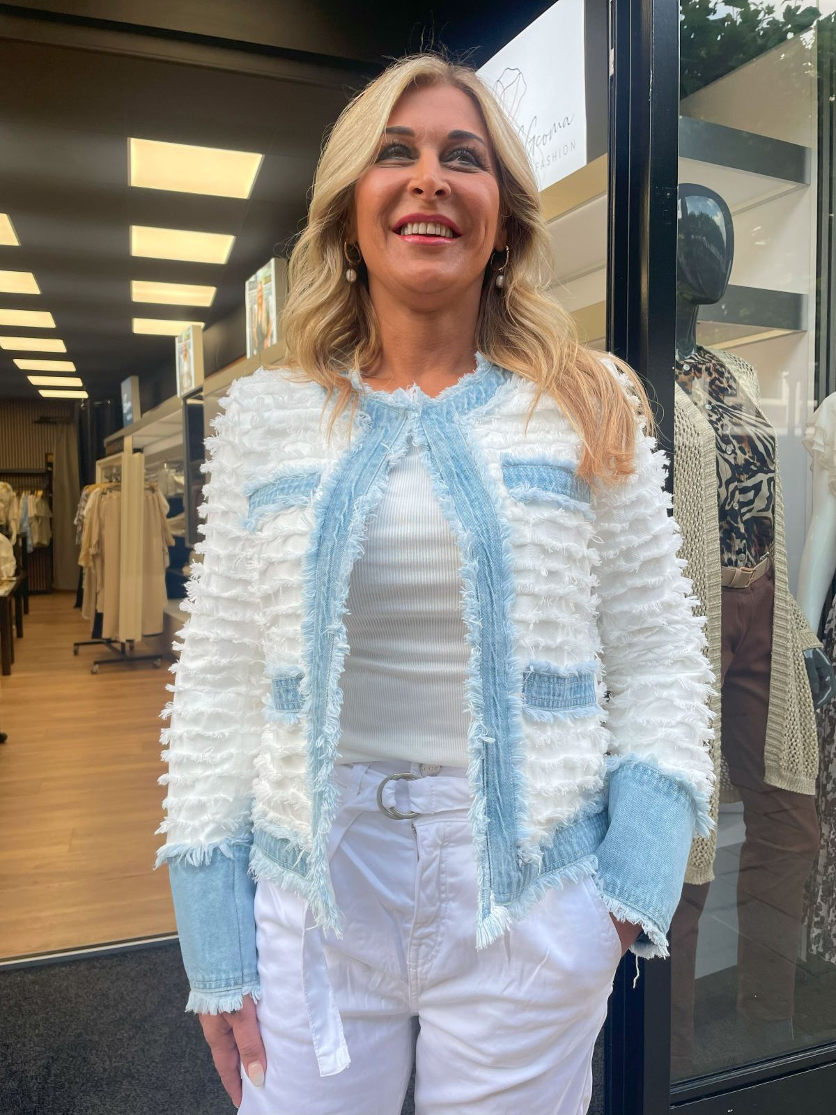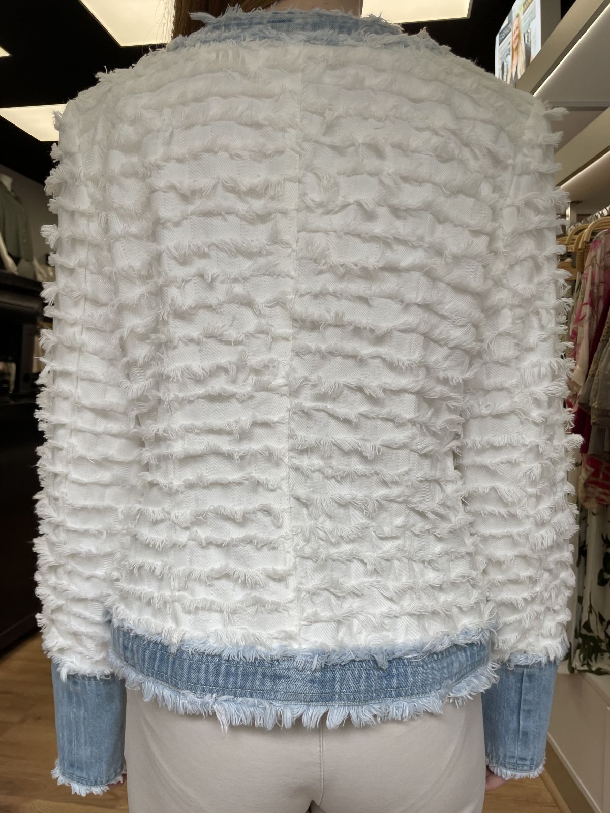 Jasje COCO is een kort, stijlvol damesjasje met een opvallende franjestructuur en stoere denimdetails. De bouclé-achtige stof is gemaakt van katoen en verwerkt in horizontale franjes die zorgen voor een unieke textuur en een eigentijdse twist op het klassieke Chanel-silhouet.
