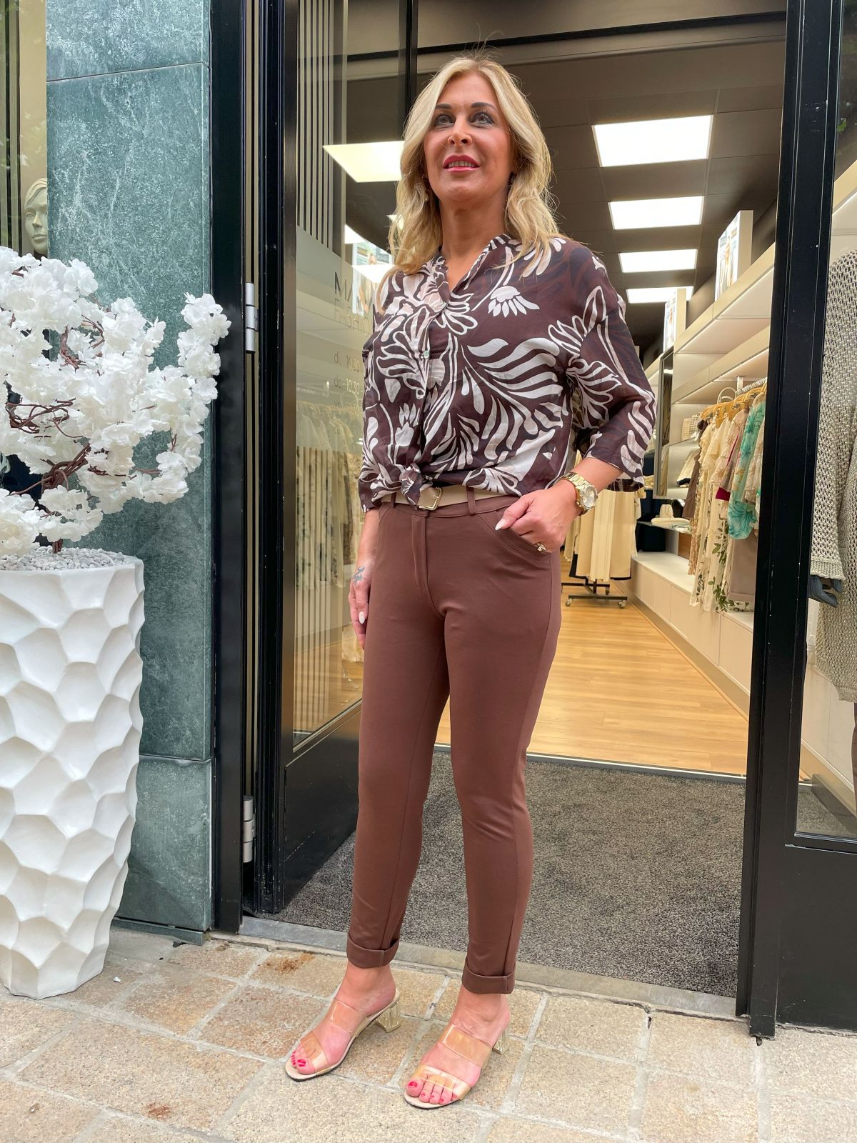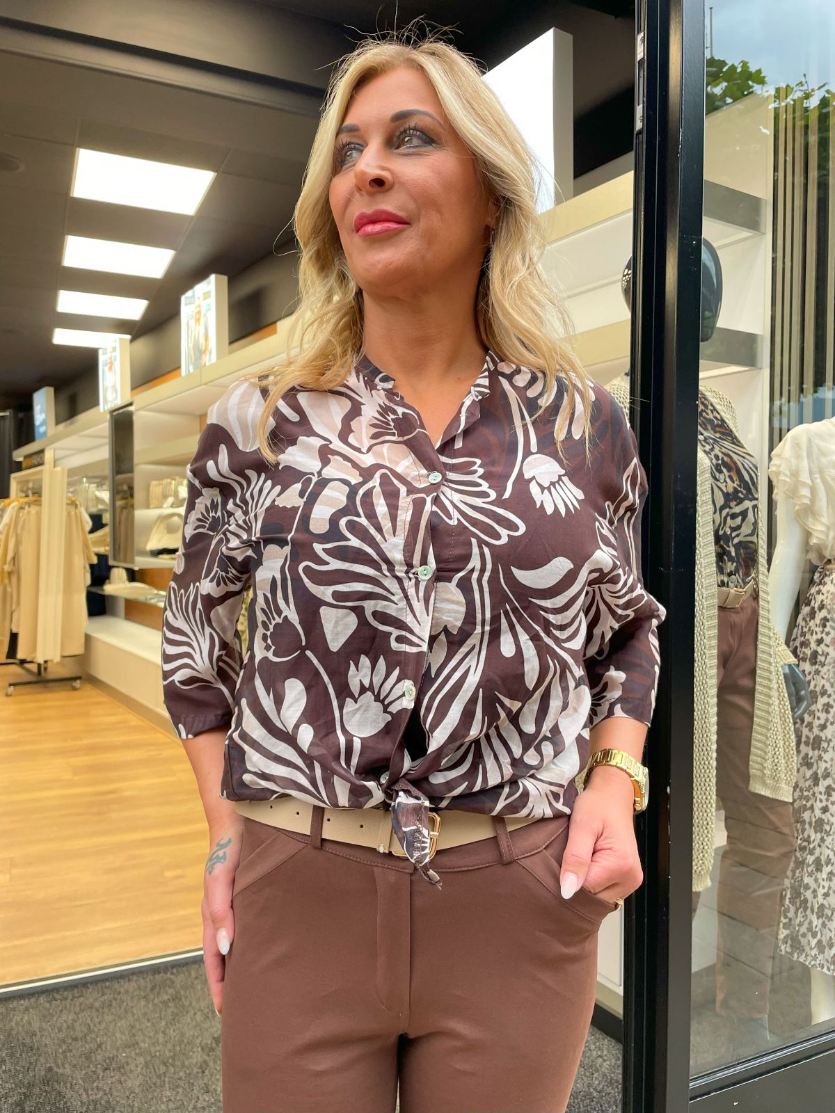 Blouse Brenda is een elegante blouse van een luchtige zijden/katoenen mix, uitgevoerd in warme bruintinten met een subtiele bloemenprint. De soepele stof voelt zacht aan op de huid en geeft de blouse een verfijnde, vrouwelijke uitstraling. Het model is voorzien van een klassieke kraag, knoopsluiting en lange mouwen met een lichte plooi bij de schouders.