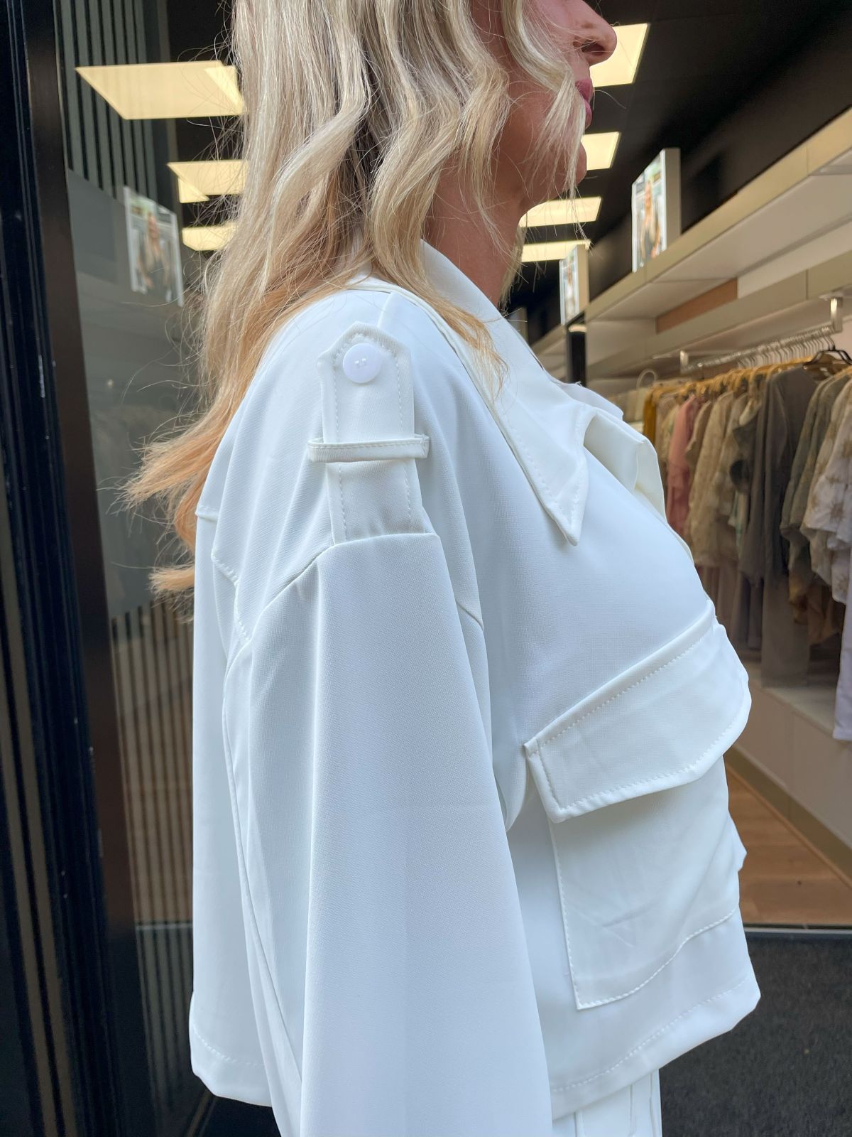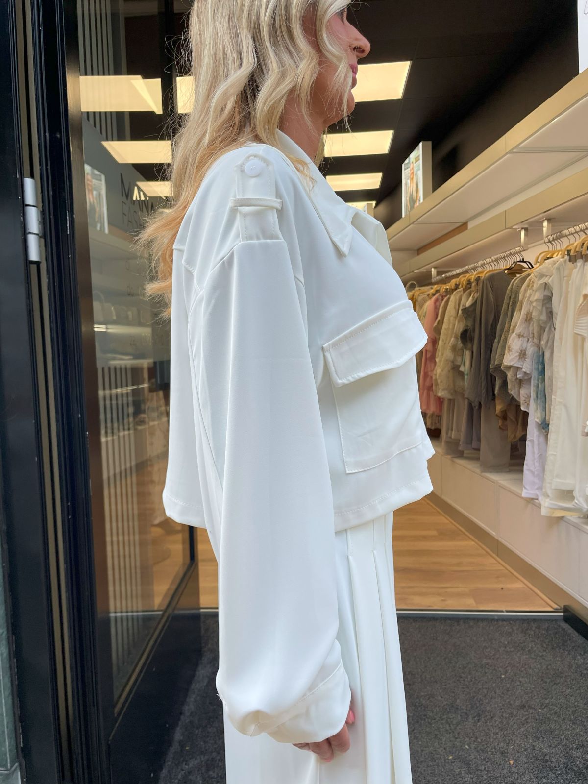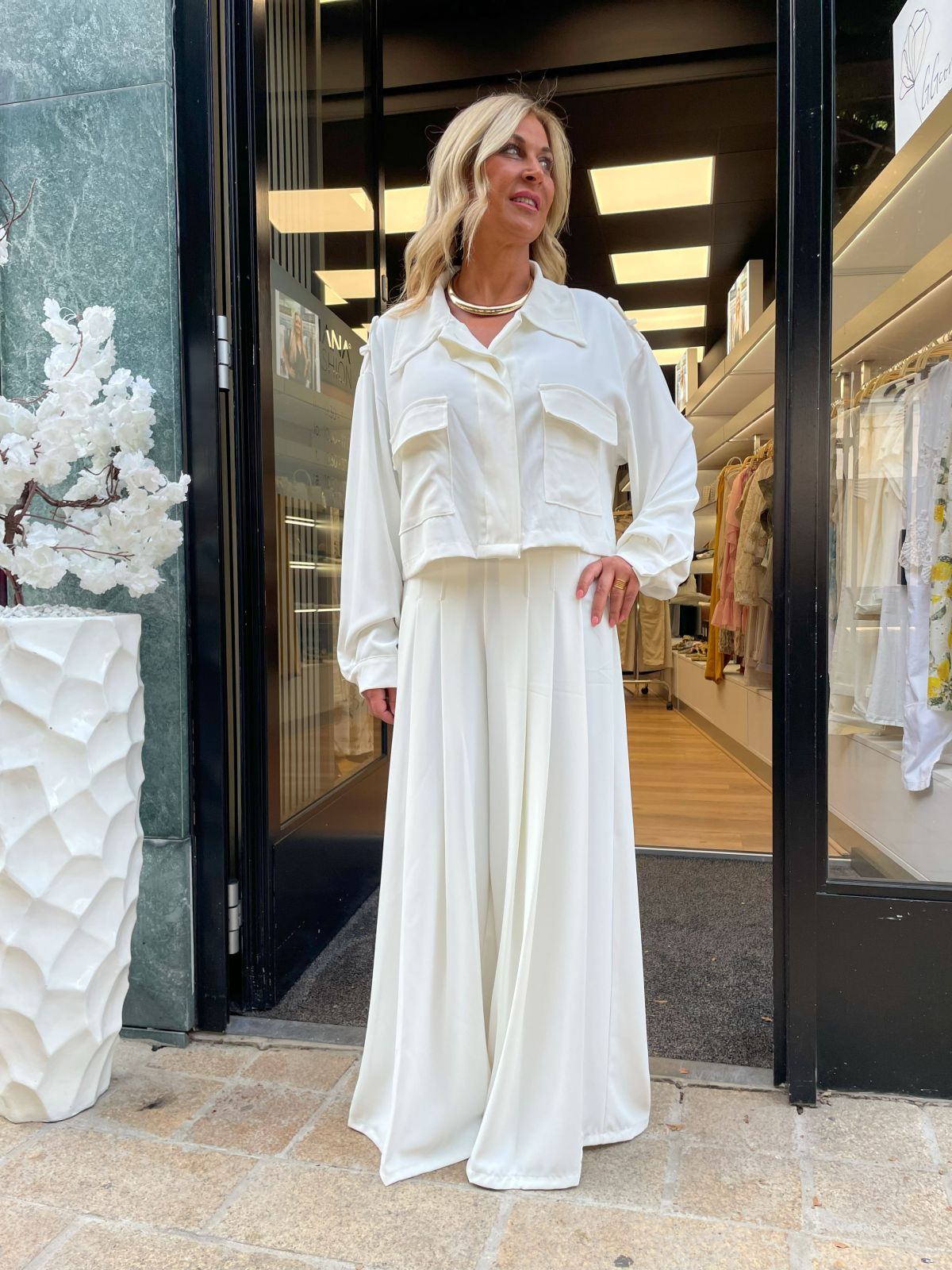 Deze tweedelige set Dafne is een stijlvolle combinatie van vrouwelijkheid en flair. De soepelvallende blouse met kraag, knoopsluiting en opvallende borstzakken heeft een licht cropped model en is gemaakt van een luchtige, chifon-achtige stof met subtiele glans.