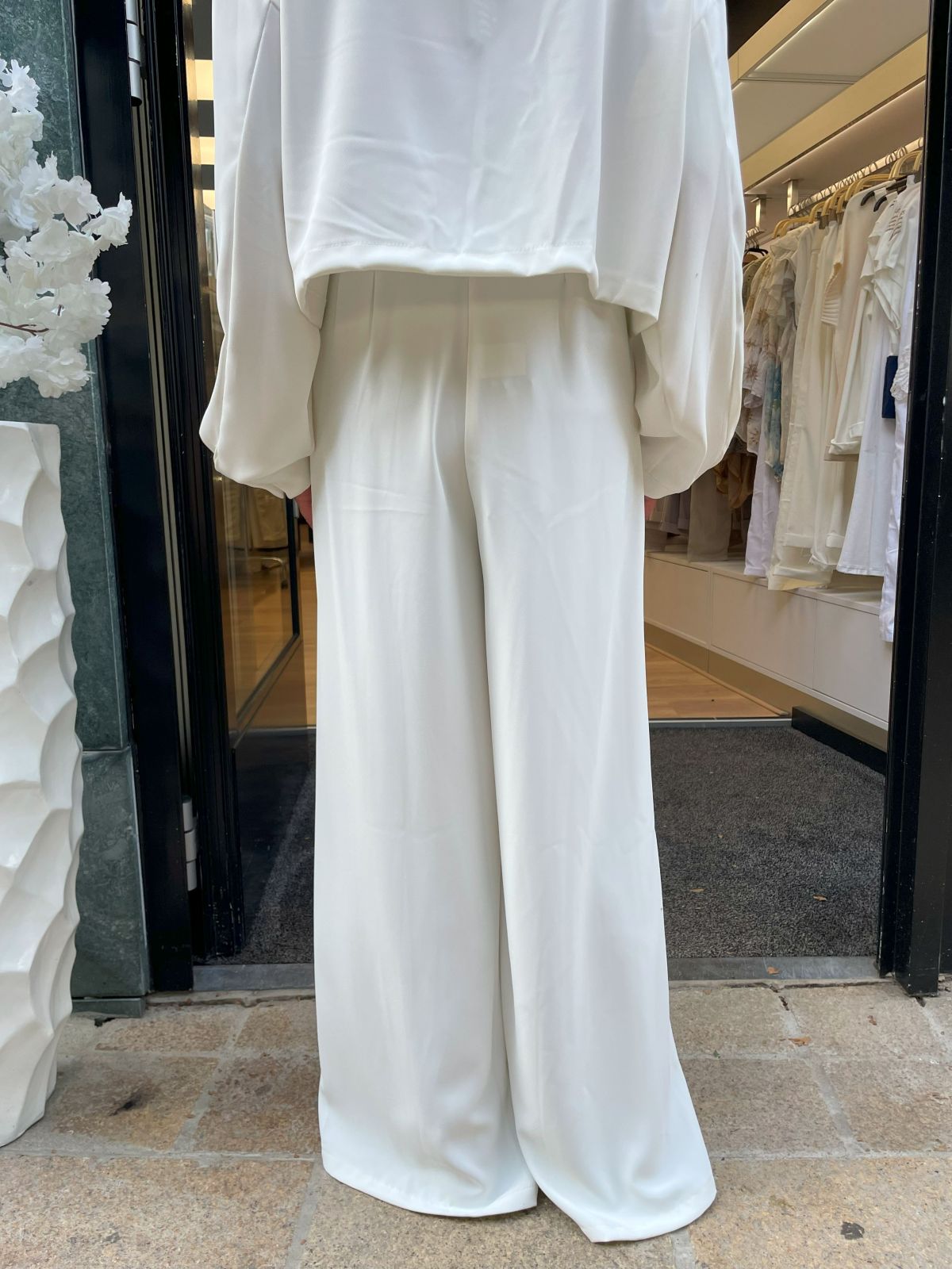 De bijpassende broek met hoge taille heeft elegante, wijde pijpen die mooi met je meebewegen en je silhouet verlengen. Dankzij de zachte, licht gevoerde stof voelt de set heerlijk luchtig aan – perfect voor warme dagen waarop je er moeiteloos chic uit wilt zien.