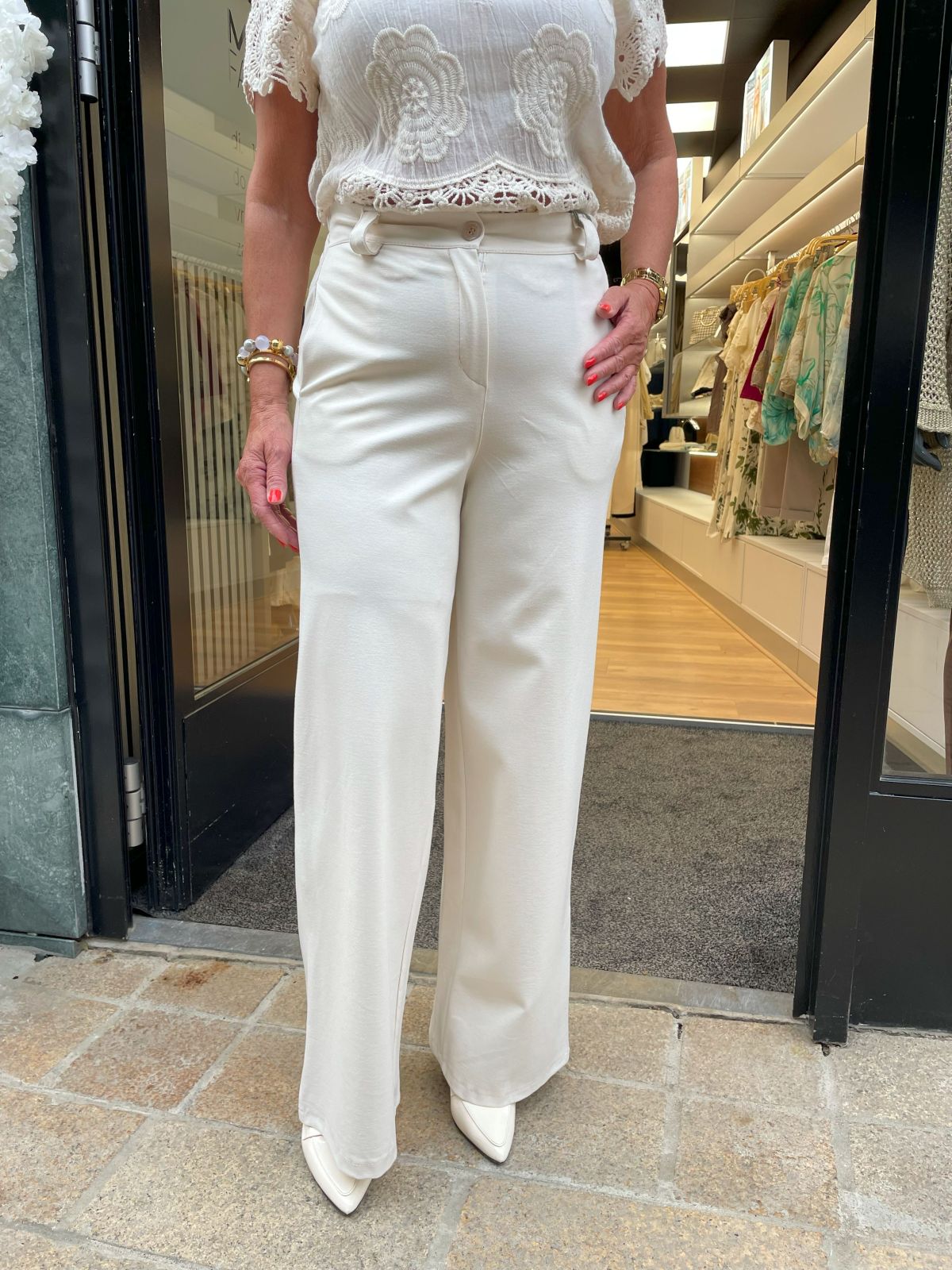Broek Lana is een elegante, luchtige broek met een hoge taille en een soepelvallend, wijd model dat vanaf de heupen losjes uitloopt tot aan de enkels. De subtiele plooien in de taille en de bijpassende beige riem geven de broek een verfijnde, vrouwelijke touch.