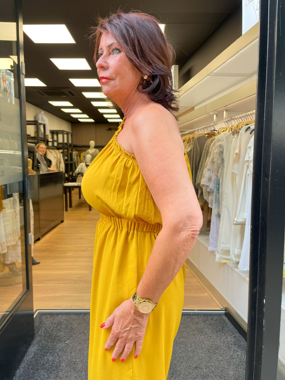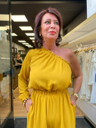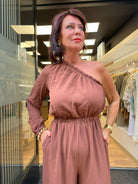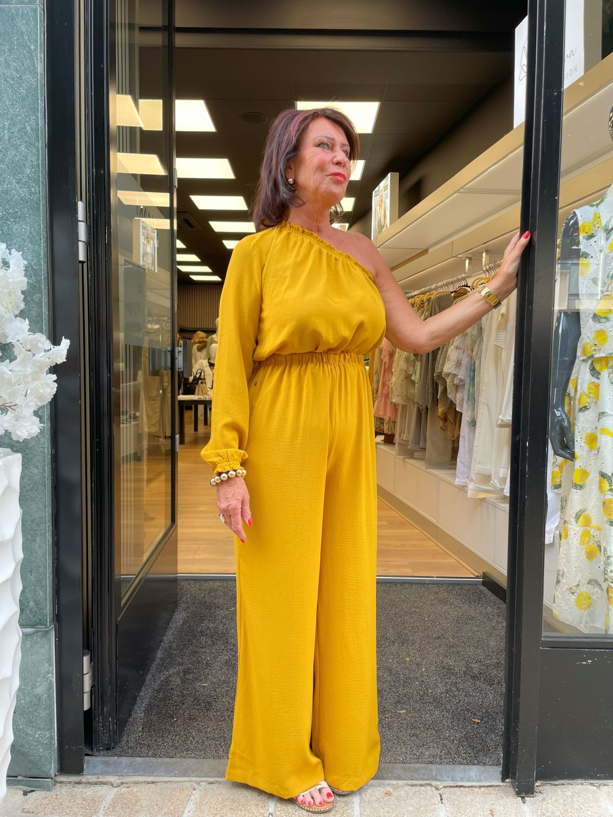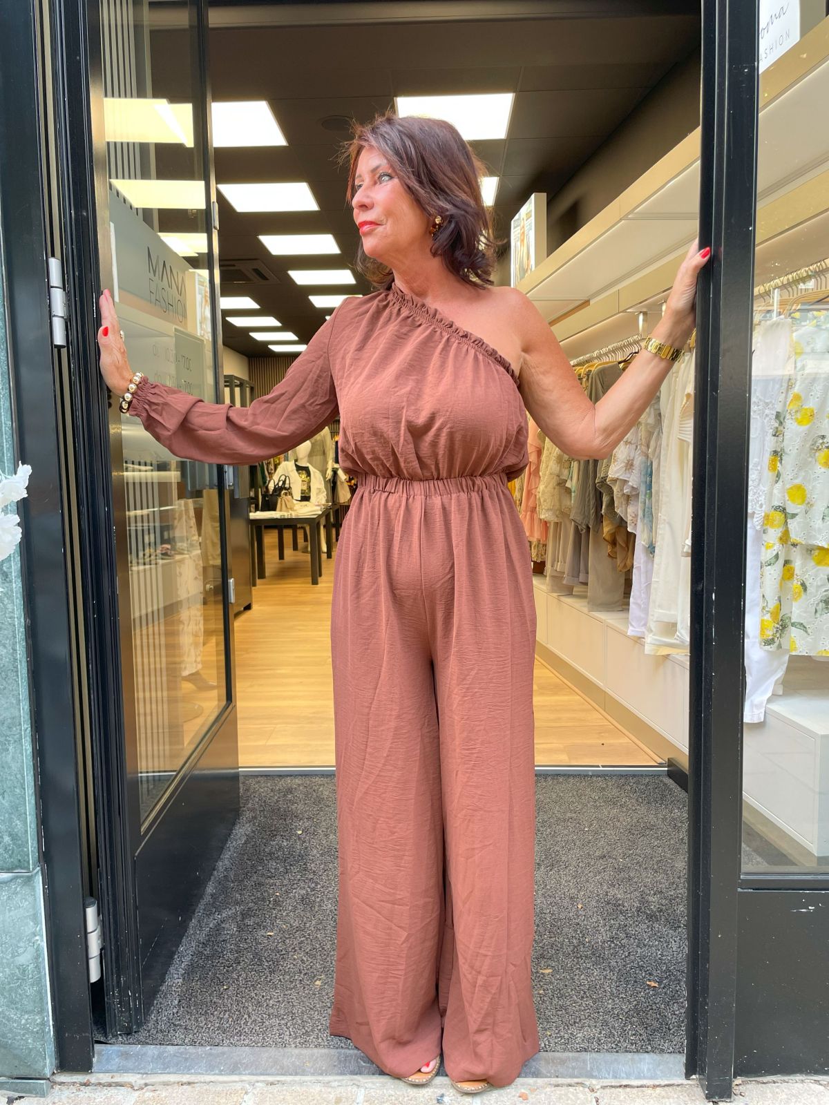 Deze stijlvolle off-shoulder jumpsuit is een echte blikvanger dankzij het asymmetrische ontwerp met één blote schouder en een lange mouw. De subtiele tailleplooien met elastiek zorgen voor een mooie, vrouwelijke pasvorm die zowel comfortabel als flatterend is.