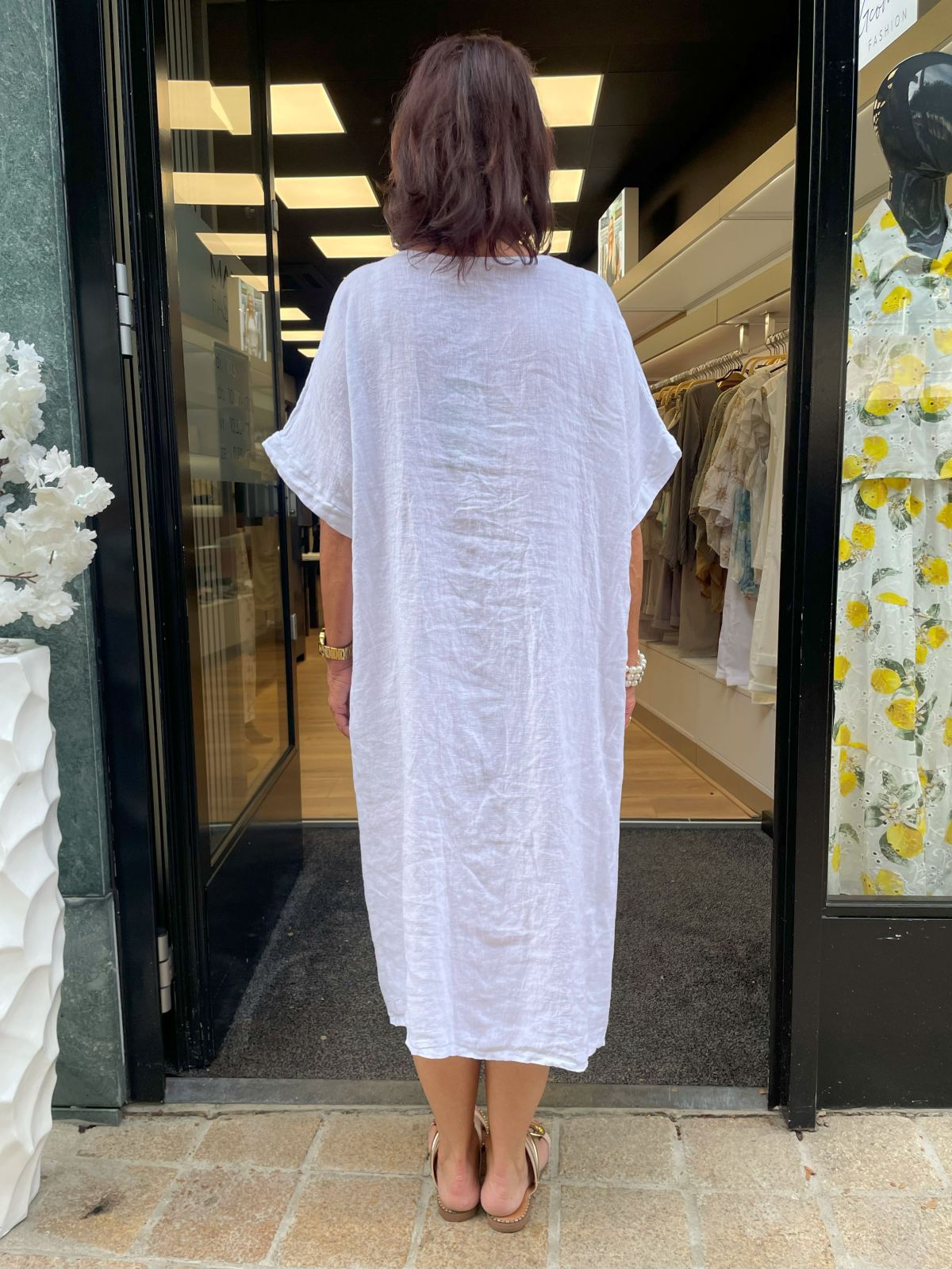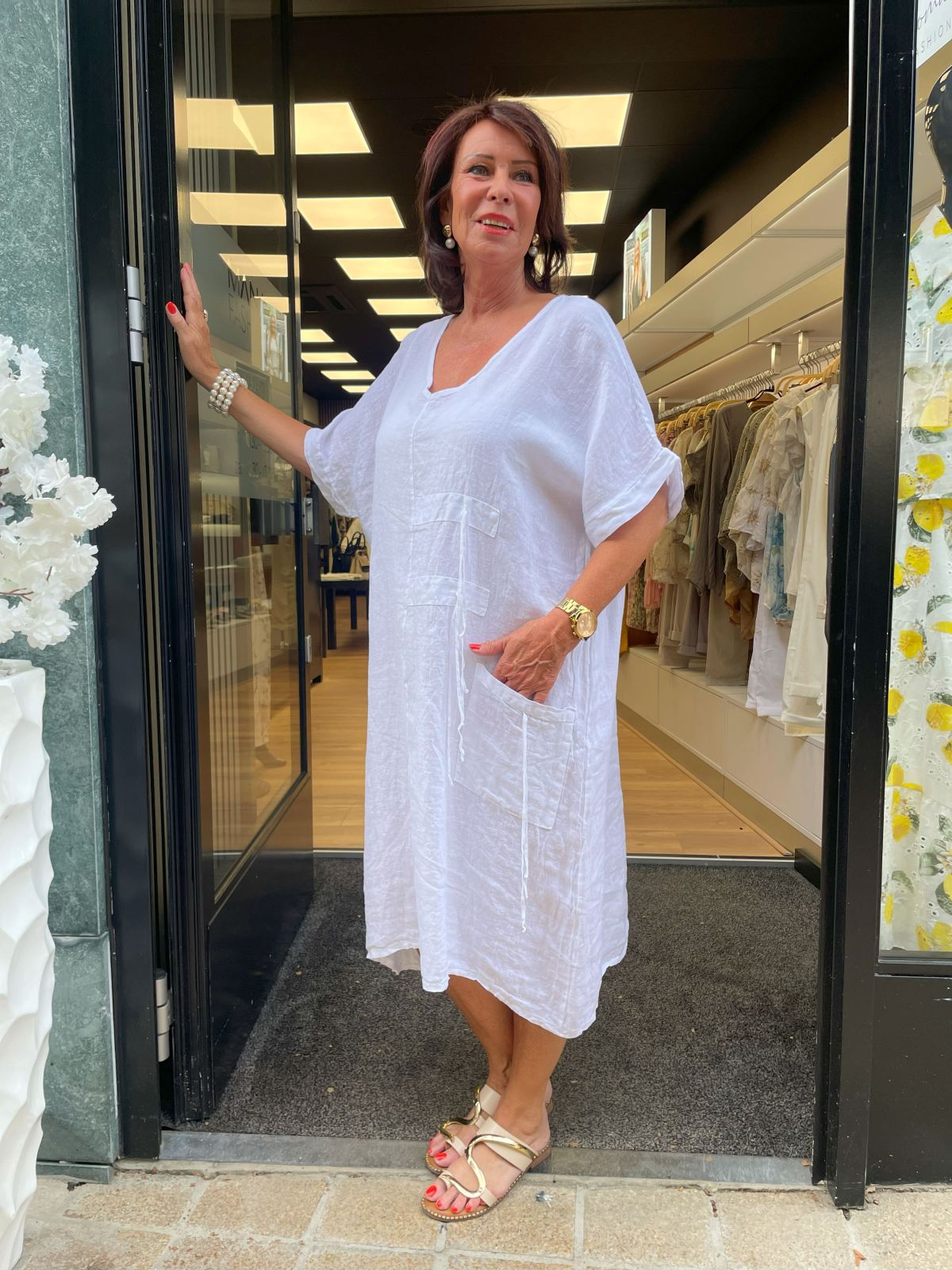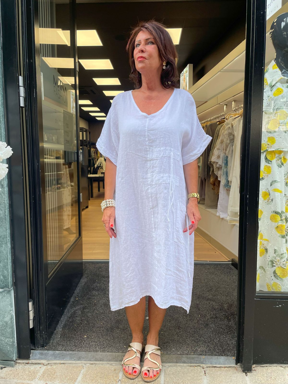 Linnen jurk Marie is zo’n item dat moeiteloos stijl en comfort combineert. Gemaakt van 100% linnen in helder wit, met een rechte pasvorm die luchtig valt en soepel meebeweegt – ideaal voor zonnige dagen waarop je wel wat extra vrijheid kunt gebruiken.