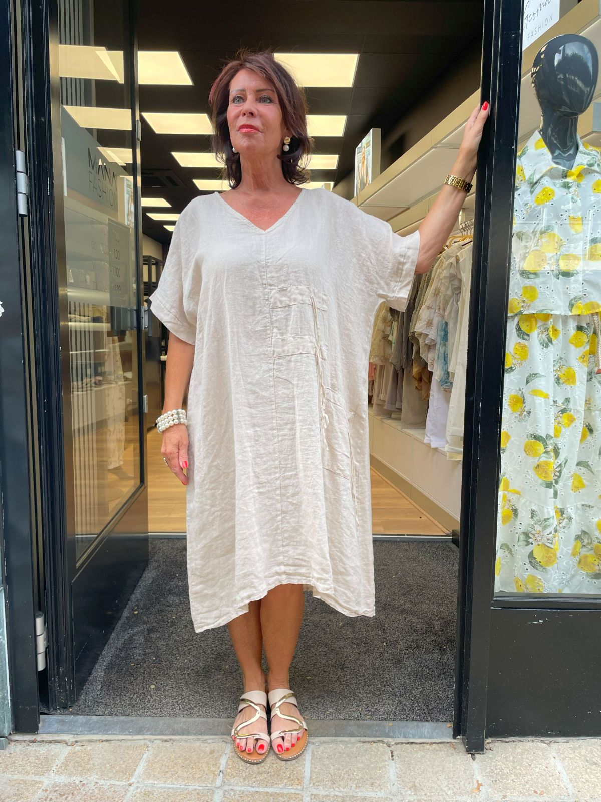 Deze jurk valt ruim als maat 42/46 en laat zich makkelijk combineren met sandalen, espadrilles of sneakers voor een natuurlijke, nonchalante look. Of je nu op het terras zit of een dagje door de stad struint — met Marie voel je je goed én zie je er goed uit.