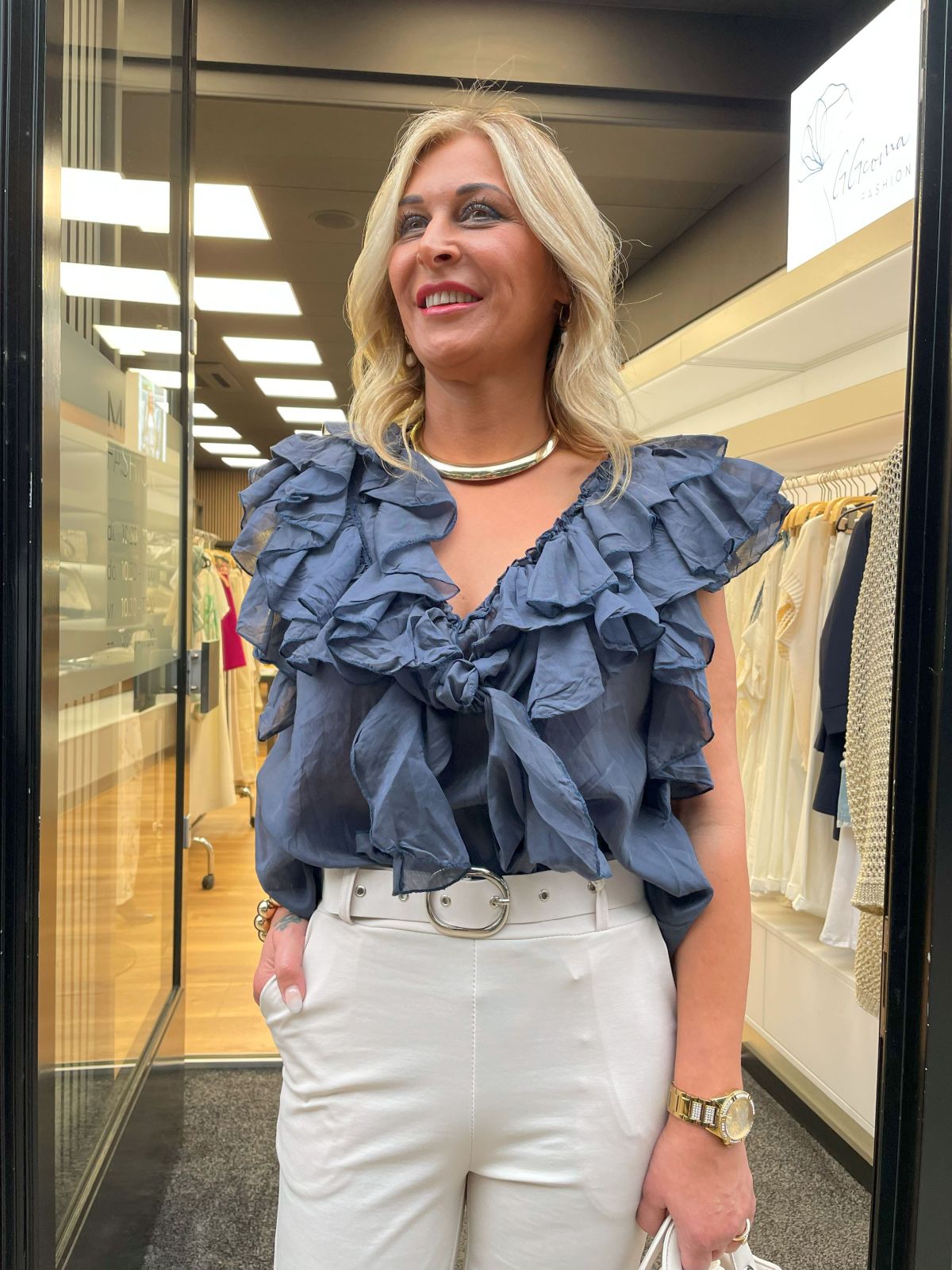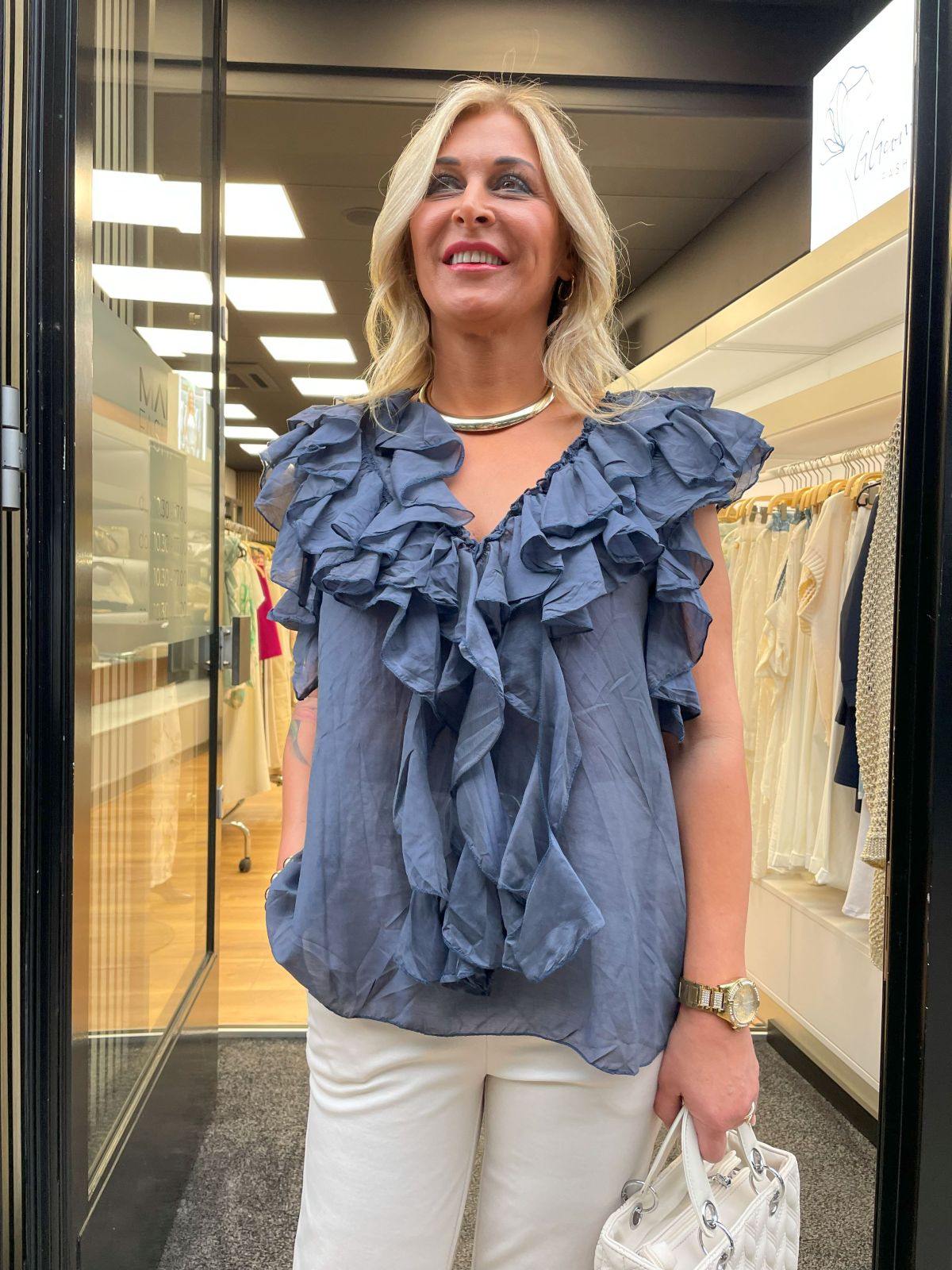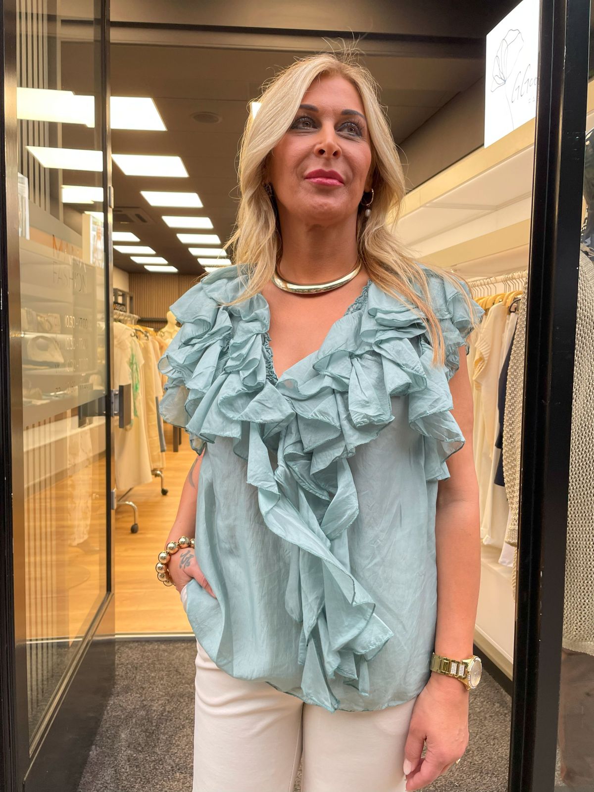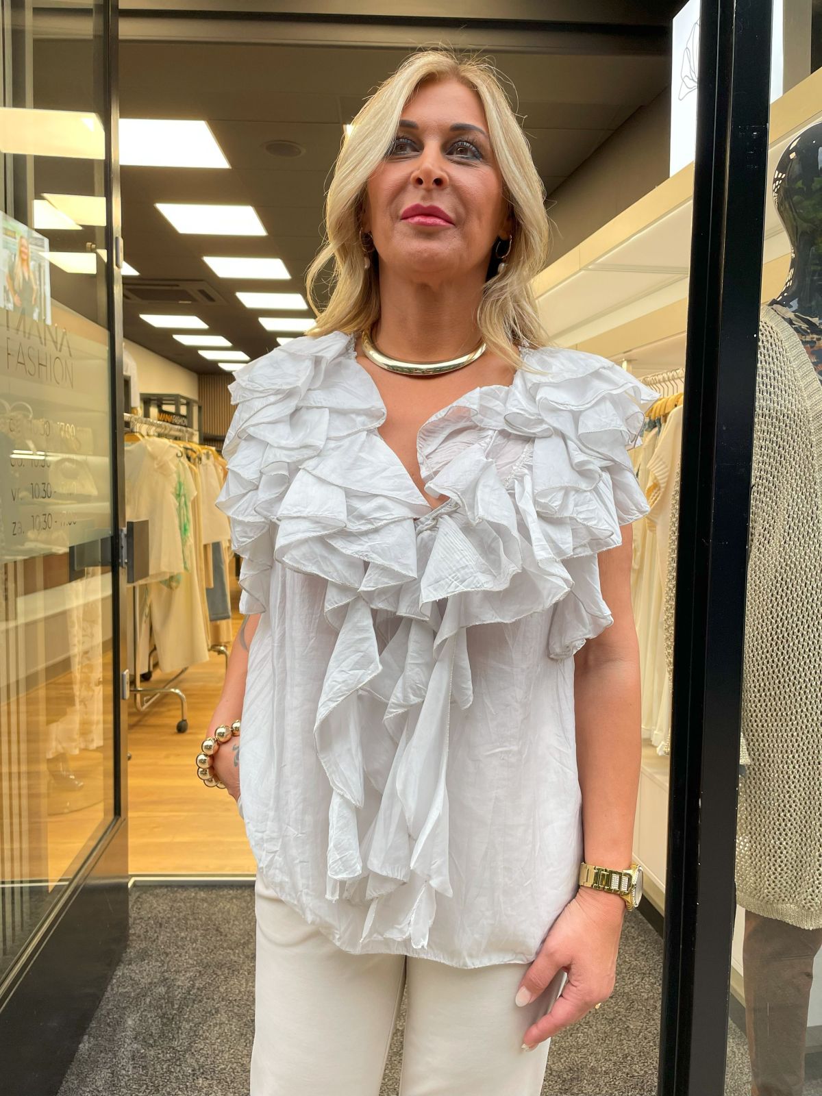 De top is voorzien van een flatterende V-hals en een knoopsluiting met langs beide zijden subtiele ruches. Dit detail geeft de top een speelse, romantische uitstraling zonder overdreven te zijn. Het model is licht getailleerd maar valt losjes, waardoor het makkelijk combineert met verschillende stijlen.